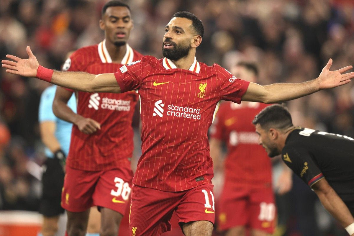 Liverpool's Mohamed Salah celebrates after scoring his side's second goal during the Champions League soccer match between Liverpool and Bologna at the Anfield stadium in Liverpool, England, Wednesday, Oct. 2, 2024. (AP Photo/Ian Hodgson)