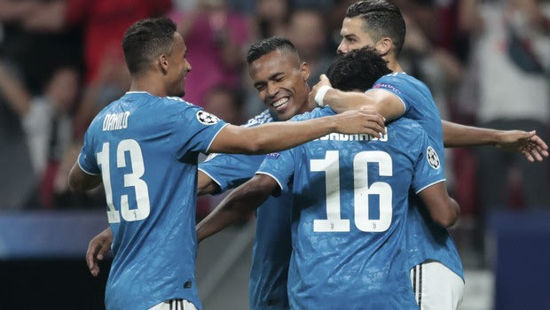 Juventus players hug teammate Juan Cuadrado, with number 16, after he scored his side's first goal during the Champions League Group D soccer match between Atletico Madrid and Juventus at the Wanda Metropolitano stadium in Madrid, Spain, Wednesday, Sept. 18, 2019. (AP Photo/Bernat Armangue)