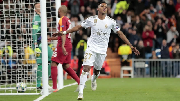 Real Madrid's Rodrygo celebrates after scoring his side's second goal during a Champions League group A soccer match between Real Madrid and Galatasaray at the Santiago Bernabeu stadium in Madrid, Wednesday, Nov. 6, 2019. (AP Photo/Bernat Armangue)
