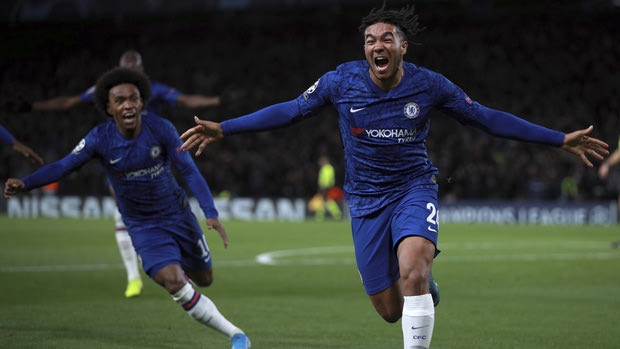 Chelsea's Reece James, right, celebrates with teammates after scoring his side's fourth goal during the Champions League, group H, soccer match between Chelsea and Ajax, at Stamford Bridge in London, Tuesday, Nov. 5, 2019. (AP Photo/Ian Walton)