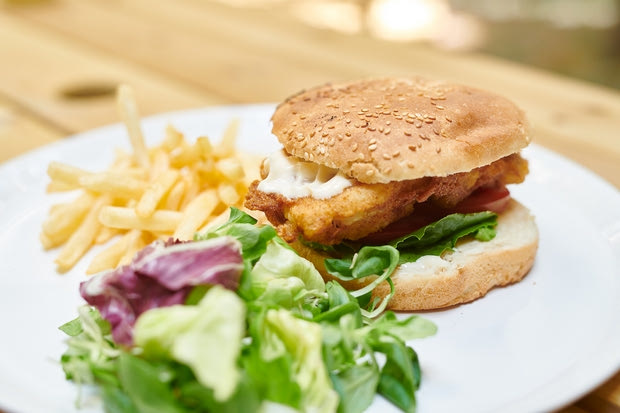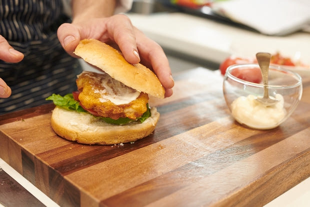 Την ώρα που θα σκοράρει ο Χάρι Κέιν ένα ακόμη γκολ, εσείς μπορείτε να τρώτε ένα burger μπακαλιάρου πανέ με μαγιονέζα garlic mayo. Φρυγάνισμα στο ψωμάκι, προσθέστε το μαρούλι ,την τομάτα και τον μπακαλιάρο και από δίπλα για γαρνιτούρα πατάτες τηγανητές και μουστάρδα dijon.