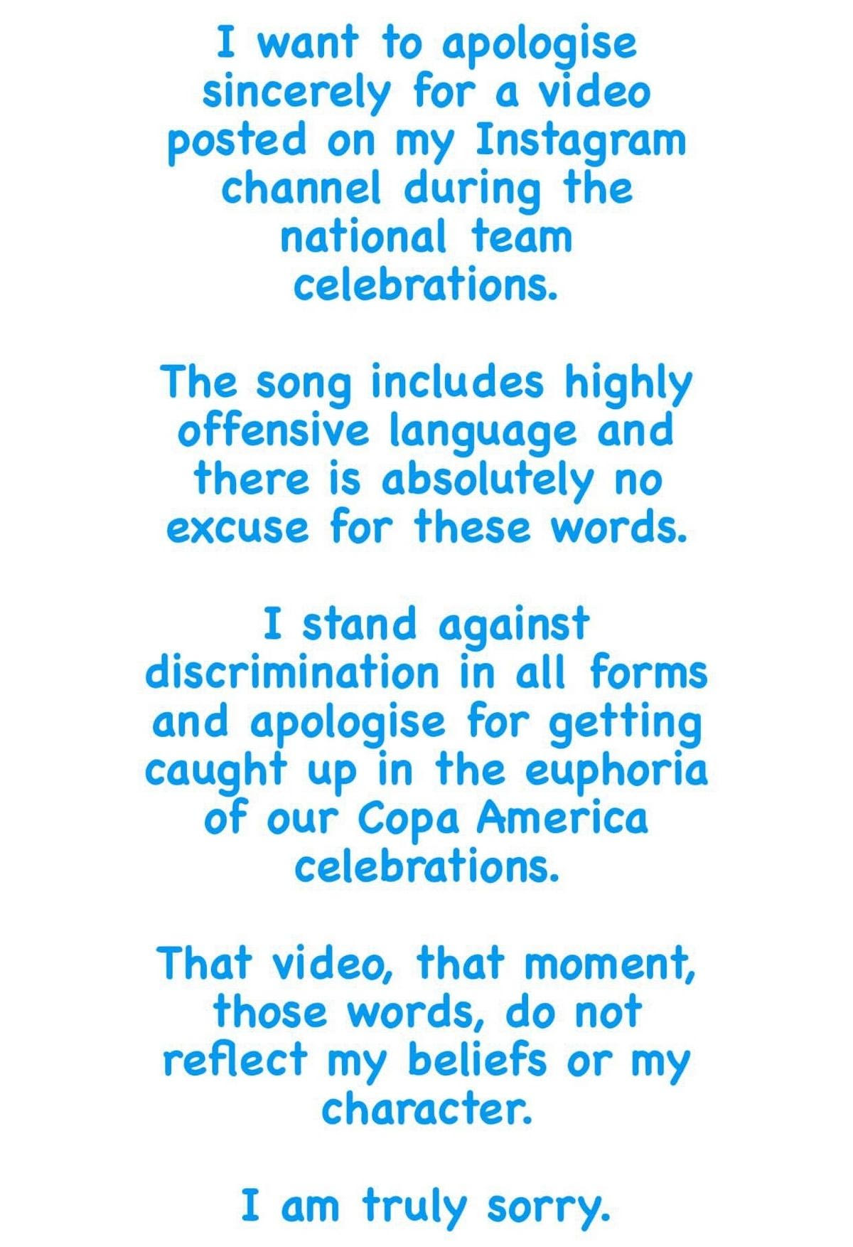 Στέκομαι ενάντια στις διακρίσεις σε όλες τους τις μορφές και απολογούμαι που παρασύρθηκα από την ευφορία των πανηγυρισμών για την κατάκτηση του Copa America. Αυτό το βίντεο, αυτή η στιγμή, αυτές οι λέξεις, δεν αντικατοπτρίζουν τα ”πιστεύω” μου ή τον χαρακτήρα μου.