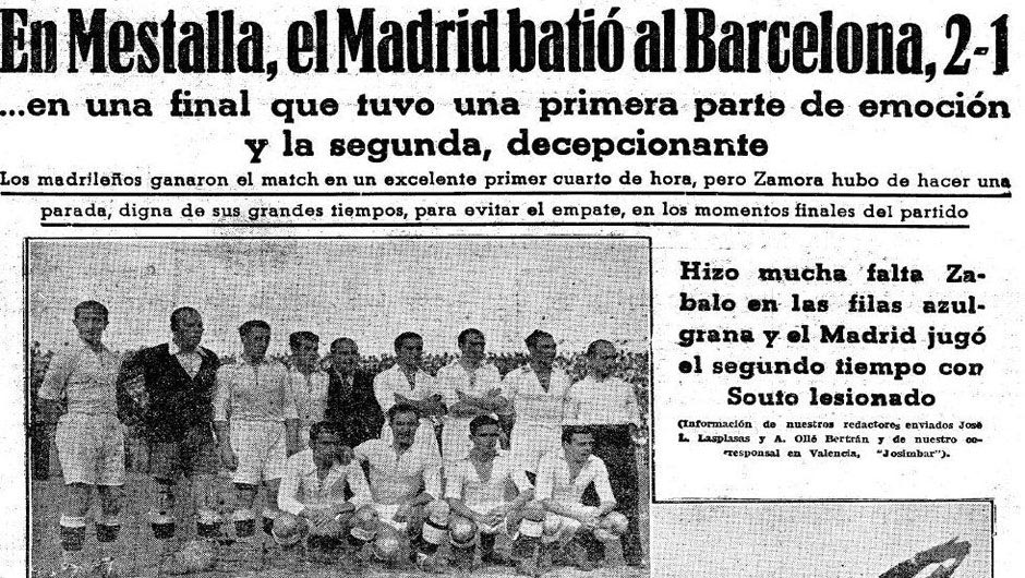 Ο πρώτος – και τελευταίος – προπολεμικός τελικός της Copa de España (όπως λεγόταν τότε η διοργάνωση) ανάμεσα στους «αιώνιους», διεξήχθη στο «Mestalla» της Βαλένθια λίγες μέρες πριν ξεσπάσει ο Ισπανικός Εμφύλιος. Οι «μερένγκες» ξεκίνησαν εντυπωσιακά και προηγήθηκαν πολύ νωρίς 2-0, η Μπαρτσελόνα μείωσε στο 21’ και από εκεί και μετά ο τελικός «τελείωσε», αφού οι δυο ομάδες μάλλον κακοποίησαν το ποδόσφαιρο, όπως αναφέρει χαρακτηριστικά ο Τύπος της εποχής. Ο Θαμόρα, με μια μεγάλη απόκρουση στα τελευταία λεπτά, κράτησε τη νίκη και το τρόπαιο πήρε το δρόμο για τη Μαδρίτη.