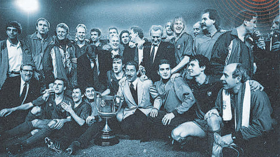 Οι παίκτες της Μπαρτσελόνα ποζάρουν με το τρόπαιο. Ακριβώς αριστερά στο Κύπελλο, ο Ερνέστο Βαλβέρδε.