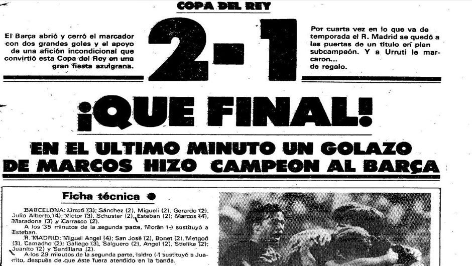 Πρόκειται για τον μοναδικό μεγάλο τίτλο που κατέκτησε ο Ντιέγο Μαραντόνα με τη φανέλα της Μπαρτσελόνα. Ο «δικός μας» Βίκτορ Μουνιόθ άνοιξε το σκορ μετά την εκπληκτική ασίστ του «Πελούσα» (απολαύστε το στο βίντεο), με τους συντοπίτες του, «Μάνιος», να παραληρούν στις εξέδρες της «Ρομαρέδα», αλλά στη συνέχεια ο Σαντιγιάνα ισοφάρισε για τη Ρεάλ. Το ματς συνεχίστηκε με απόλυτη ισορροπία, όμως στο 90’ ο Μάρκος Αλόνσο έστειλε τη μπάλα στα δίχτυα και έδωσε το τρόπαιο στους «μπλαουγκράνα». Τεράστιες ποδοσφαιρικές παρουσίες και στις δυο ομάδες: Μαραντόνα, Βίκτορ, Σούστερ, «Λόμπο» Καράσκο, Χούλιο Αλμπέρτο από τη μια, Σαντιγιάνα, Καμάτσο, Γκαγιέγο, Στίλικε, Χουανίτο από την άλλη!
