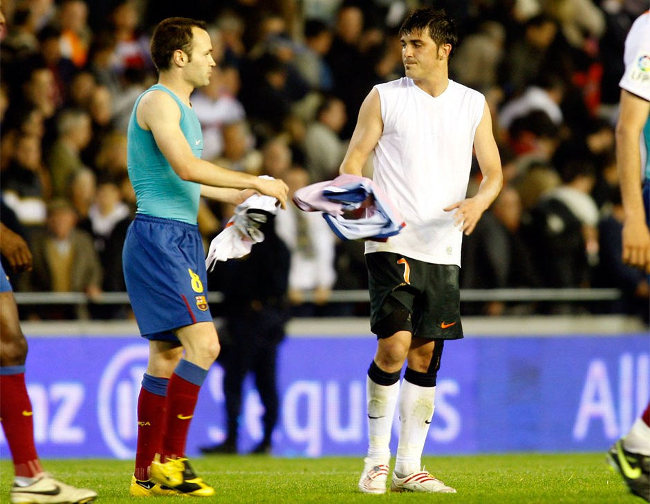 10. Βίγια και Ινιέστα ανταλλάσσουν φανέλες μετά τη λήξη του παιχνιδιού Βαλένθια-Μπαρτσελόνα (2-2) στο «Μεστάγια» (25/4/2009).