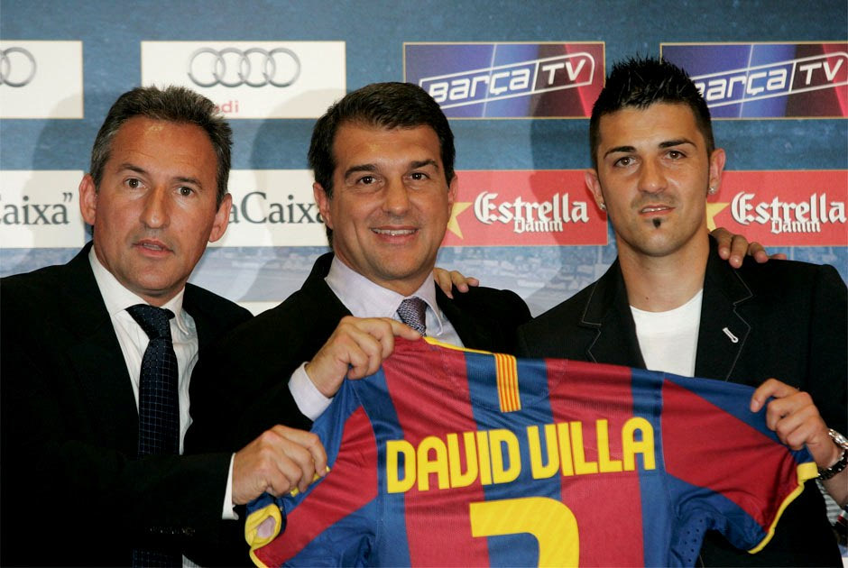 13. Στις 19 Μαΐου του 2010 η Βαλένθια έφτασε σε συμφωνία με τη Μπαρτσελόνα για την παραχώρηση του Βίγια έναντι του ποσού των 40 εκατομμυρίων ευρώ. Δυο μέρες αργότερα, ο «Guaje» παρουσιάστηκε επίσημα από τη διοίκηση των «μπλαουγκράνα». Εδώ, ο Βίγια μαζί με τον τότε πρόεδρο Τζουάν Λαπόρτα και τον Τσίκι Μπεγκιριστάιν (21/5/2010).