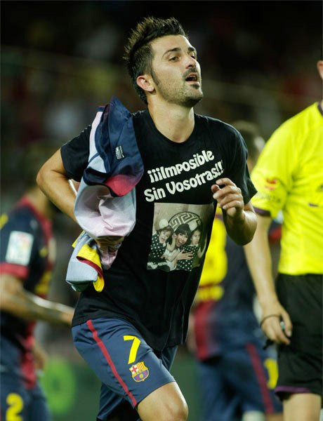 22. Οκτώ μήνες μετά τον σοβαρό τραυματισμό του, ο Βίγια επανήλθε στην ενεργό δράση την πρώτη αγωνιστική της σεζόν 2012/13, απέναντι στη Ρεάλ Σοθιεδάδ. Πέρασε ως αλλαγή στο παιχνίδι στη θέση του Πέδρο και λίγα λεπτά αργότερα πέτυχε το πέμπτο τέρμα των «μπλαουγκράνα» στο τελικό 5-1, γνωρίζοντας πραγματική αποθέωση από τους φιλάθλους της Μπαρτσελόνα. Εδώ πανηγυρίζει την επιστροφή του στα γκολ με μια αφιέρωση στην οικογένειά του. «Χωρίς εσάς θα ήταν αδύνατο», γράφει η μπλούζα, ενώ στη φωτογραφία φαίνονται η σύζυγός του και οι δυο του κόρες (19/8/2012).