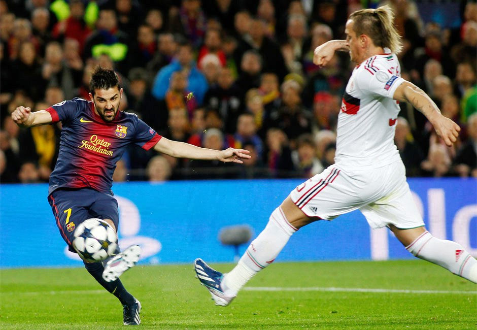 24. Η τελευταία μεγάλη εμφάνισή του με τη Μπαρτσελόνα ήρθε φέτος στη φάση των «16» του Τσάμπιονς Λιγκ, στη μεγάλη ανατροπή επί της Μίλαν. Ο Βίγια πέτυχε το καθοριστικό τρίτο γκολ που έδινε πλέον σκορ πρόκρισης στους «μπλαουγκράνα», ενώ στα προημιτελικά ήταν αυτός που έβγαλε την ασίστ στον Πέδρο για να ισοφαρίσει την Παρί και να δώσει το εισιτήριο για τον ημιτελικό στους Καταλανούς. Εδώ ο Βίγια πλασάρει στην εστία της Μίλαν, ενώ ο Φιλίπ Μεξές προσπαθεί να τον σταματήσει (12/3/2013).