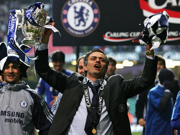 CARDIFF, UNITED KINGDOM: Chelsea manager Jose Mourinho celebrates his team's victory in the English League Cup Final football match against Arsenal at The Millennium Stadium, Cardiff, Wales, 25 February 2007. Chelsea won 2-1. AFP PHOTO / PAUL ELLIS Mobile and website use of domestic English football pictures subject to a subscription of a license with Football Association Premier League (FAPL) tel: +44 207 2981656. For newspapers where the football content of the printed and electronic versions are identical, no license is necessary. (Photo credit should read PAUL ELLIS/AFP/Getty Images)