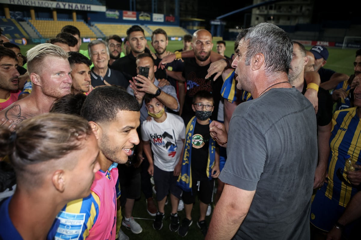 Μετά το 1-0 έκανε ένα σπρίντ και μπήκε να πανηγυρίσει μαζί με τους παίκτες του ενώ η λήξη τον βρήκε συγκινημένο και με δάκρυα στα μάτια.