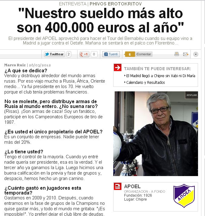 Σε συνέντευξη που παραχώρησε στην Ισπανική "As" ο πρόεδρος του ΑΠΟΕΛ, Φοίβος Ερωτοκρίτου απάντησε σχετικά με τα οικονομικά της ομάδας του αλλά και ποια πιστεύει θα είναι η έκβαση του αγώνα με την Ρεάλ στην Κύπρο.