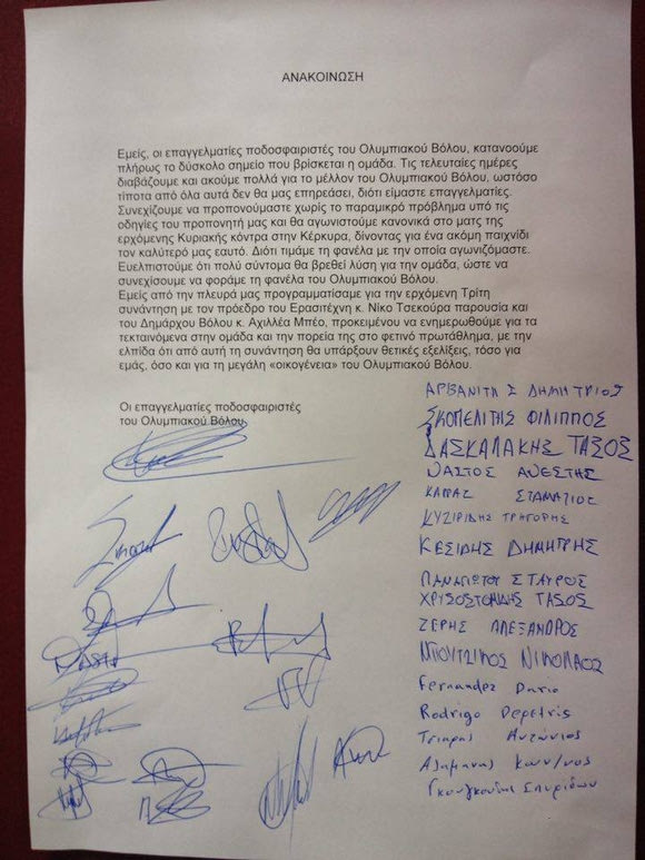 Οι ποδοσφαιριστές του Ολυμπιακού Βόλου με ανακοίνωση τους τόνισαν πως παρά τα πολλά προβλήματα συνεχίζουν κανονικά στην ομάδα.