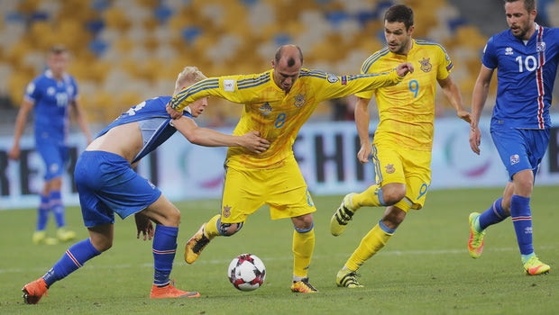 Ukraine's Roman Zozulya, center left, challenges for the ball with Iceland's Hordur Magnusson, left, during World Cup Group I qualifying soccer match between Ukraine and Iceland at the Olympiyskiy stadium in Kiev, Ukraine, Monday, Sept. 5, 2016. (AP Photo/Efrem Lukatsky) AP
