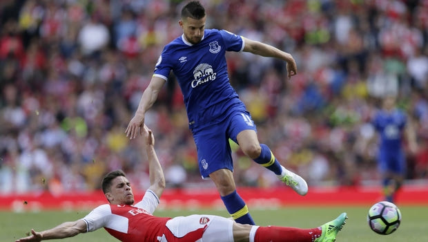 Arsenal's Gabriel Paulista, left, competes for the ball with Everton's Kevin Mirallas during the English Premier League soccer match between Arsenal and Everton at The Emirates stadium in London, Sunday May 21, 2017. (AP Photo/Tim Ireland)