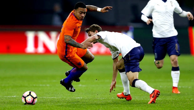 Italy's Daniele Rugani, right, fouls Netherlands' Memphis Depay, left, during the international friendly soccer match between The Netherlands and Italy at the ArenA stadium in Amsterdam, Netherlands, Tuesday, March 28, 2017. (AP Photo/Peter Dejong)