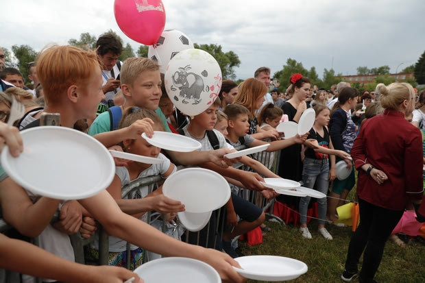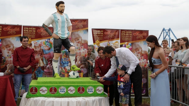 The major of Bronnitsy helps a boy cut a cake to mark Lionel Messi's birthday near Argentina training camp base at the 2018 World Cup in Bronnitsy, Russia, Sunday, June 24, 2018. Wth a cake sculpture and a music festival the town of Bronnitsy celebrated the striker's 31st birthday.(AP Photo/Ricardo Mazalan)