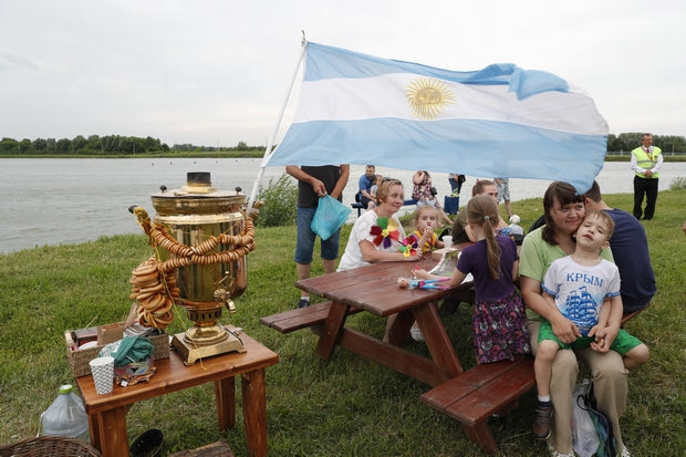 People sit by a tea samovar during a celebration to mark Lionel Messi's birthday near Argentina's training camp base at the 2018 World Cup in Bronnitsy, Russia, Sunday, June 24, 2018. Wth a cake sculpture and a music festival the town of Bronnitsy celebrated the striker's 31st birthday. (AP Photo/Ricardo Mazalan)