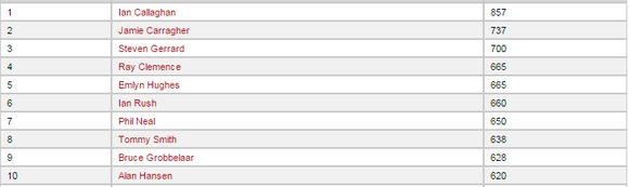 Ας δούμε τη λίστα με τους πρώτους δέκα σε συμμετοχές με τη φανέλα της Λίβερπουλ: