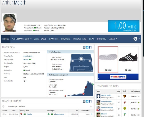 Μεταξύ των θυμάτων στην αεροπορική τραγωδία με την αποστολή της Σαπεκοένσε ήταν και ο Αρτούρ Μάια, που είχε δοκιμαστεί στον Ολυμπιακό τον χειμώνα του 2011.