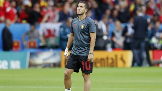 Belgium's Eden Hazard walks on the pitch prior to the Euro 2016 quarterfinal soccer match between Wales and Belgium, at the Pierre Mauroy stadium in Villeneuve dAscq, near Lille, France, Friday, July 1, 2016. (AP Photo/ Michel Spingler)