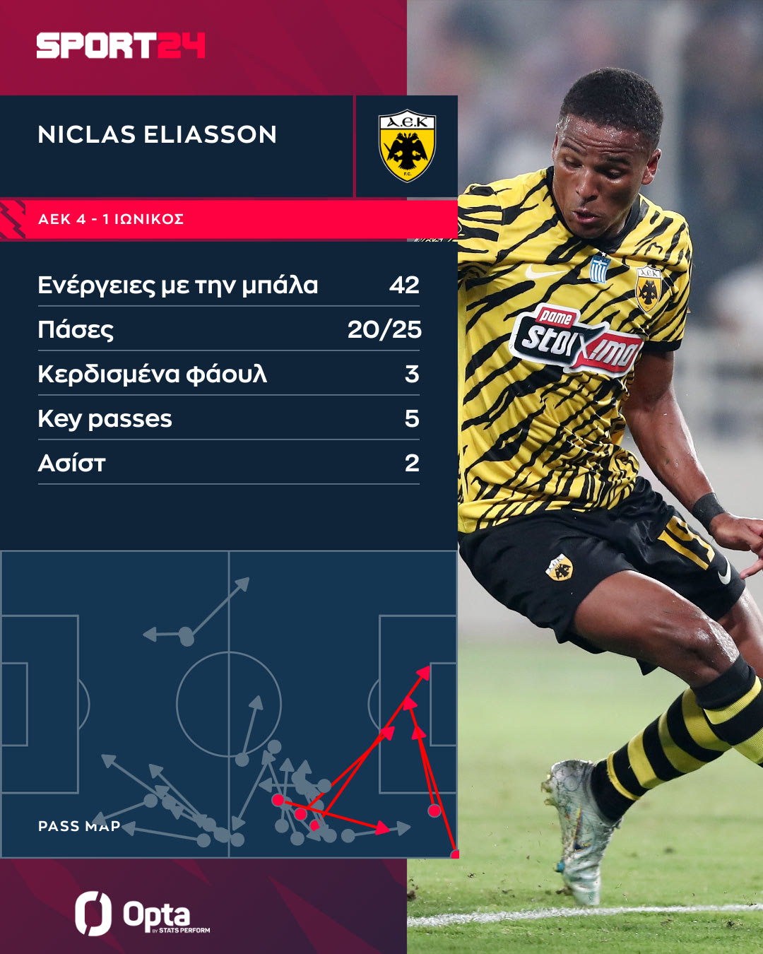 Απέναντι στον Ιωνικό, όπως φαίνεται και στο παραπάνω γράφημα της Opta/Stats Perform, ο Ελίασον ολοκλήρωσε το παιχνίδι με 5 key passes (σ.σ. πάσες που δημιούργησαν τελικές), που αποτελεί την καλύτερη επίδοση μεταξύ των παικτών που αγωνίστηκαν στο χθεσινό (03/10) παιχνίδι. Παράλληλα, ήταν πρώτος σε κερδισμένα φάουλ (3), ενώ προσέφερε και δύο εξαιρετικές ασίστ στους συμπαίκτες του.