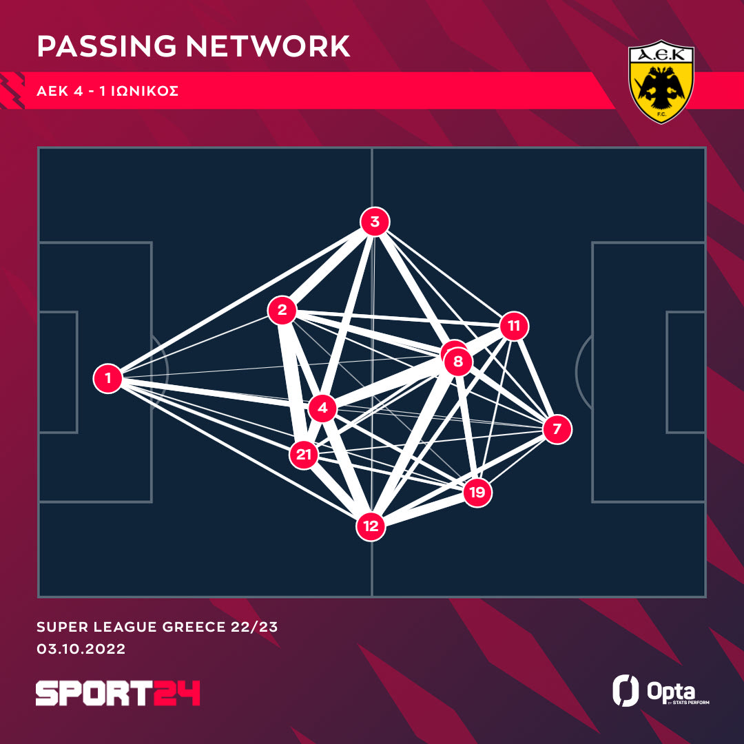 Ωστόσο, γι’ ακόμη μία αναμέτρηση, η μεσαία γραμμή της ΑΕΚ ήταν εκείνη που έκανε σε πολύ μεγάλο βαθμό τη διαφορά, είτε σε θέμα εκτέλεσης, είτε σε θέση δημιουργίας, είτε σε θέμα πίεσης. Ο Μίγιατ Γκατσίνοβιτς, που σημείωσε το ιστορικό πρώτο γκολ στην OPAP Arena, είχε έναν ελεύθερο ρόλο μέσα στον αγωνιστικό χώρο, κινούμενους, όπως φαίνεται και στο παρακάτω γράφημα, στους ίδιους χώρους με τον Ορμπελίν Πινέδα, αλλά με διαφορετικές αρμοδιότητες.