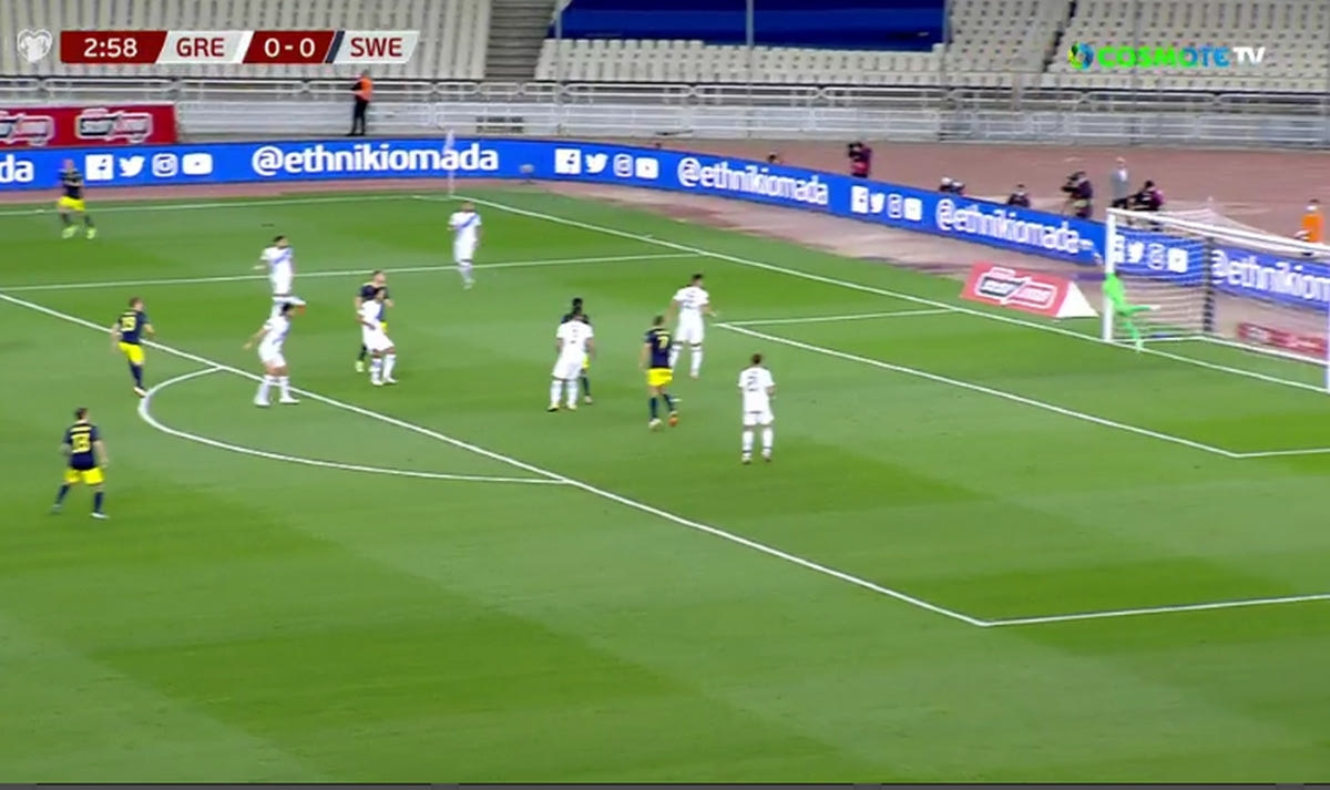 Η Σουηδία μπήκε πολύ δυνατά στο παιχνίδι απέναντι στην Εθνική μας στο ΟΑΚΑ και έγραψε την πρώτη της ευκαιρία με το δοκάρι του Σβάνμπεργκ μόλις στο 4ο λεπτό. Το δυνατό του σουτ τράνταξε το δεξί δοκάρι του Βλαχοδήμου και έμεινε το 0-0.