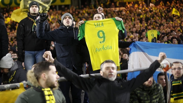 Nantes supporters show a jersey in a tribute to to Argentinian player Emiliano Sala after the French League One soccer match Nantes against Saint-Etienne at La Beaujoire stadium in Nantes, western France, Wednesday, Jan.30, 2019. Sala disappeared over the English Channel on Jan. 21, 2019 as it flew from France to Wales. Sala had just been signed by Premier League club Cardiff. (AP Photo/Thibault Camus)