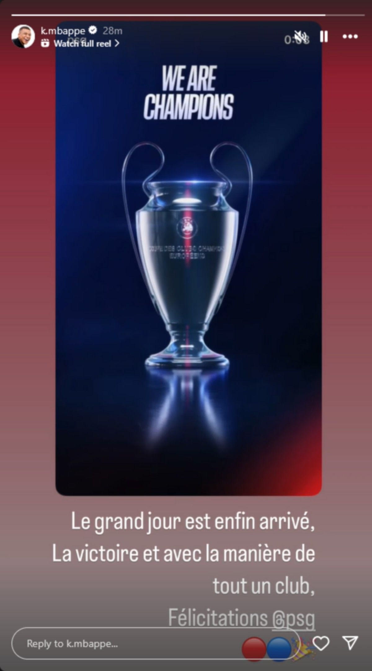 Λίγη ώρα μετά από τον θρίαμβο της Παρί Σεν Ζερμέν στον τελικό του Champions League με το 5-0 κόντρα στην Ίντερ, ο Κιλιάν Εμπαπέ θέλησε να δώσει συγχαρητήρια στην πρώην ομάδα του μέσω ανάρτησής του στο Instagram.