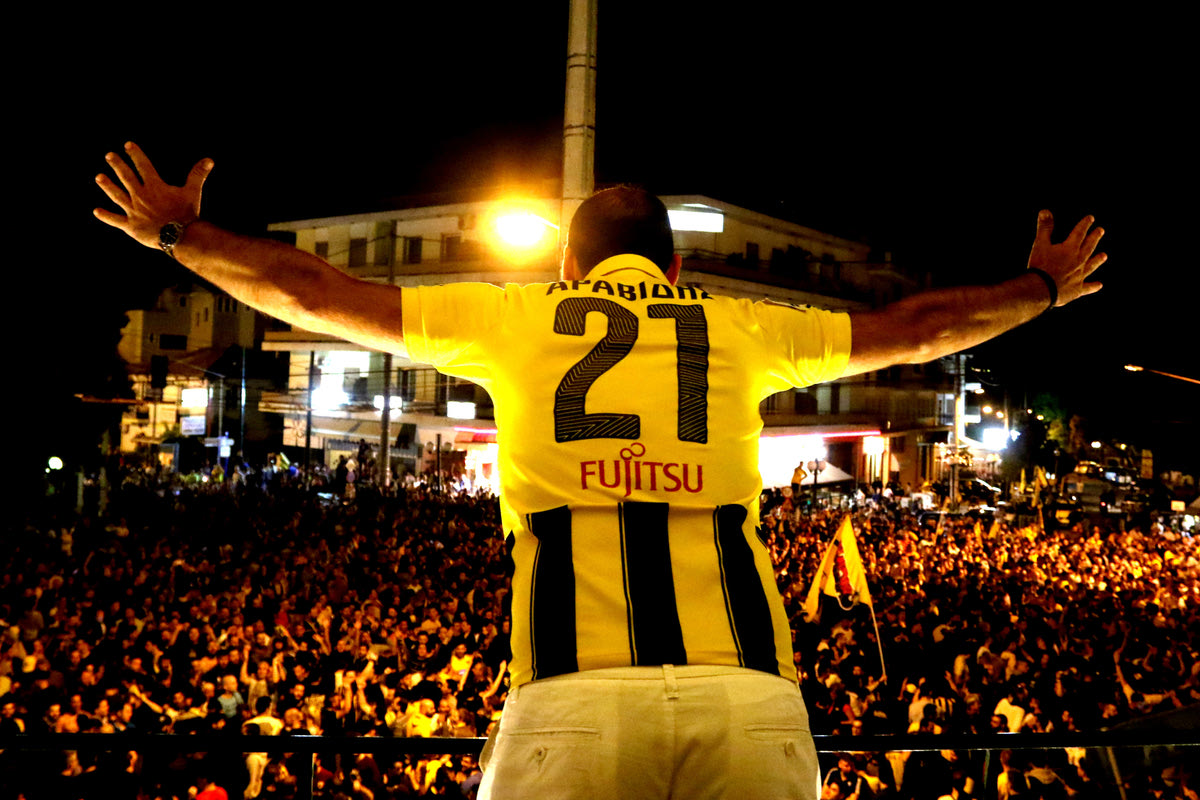 Το πούλμαν προχωρούσε αργά ανάμεσα σε χιλιάδες οπαδούς της ΑΕΚ και οι παίκτες που πλέον είχαν κατέβει από την οροφή, είχαν στήσει ένα τρελό γλέντι στο εσωτερικό. Χόρευαν στους ρυθμούς των συνθημάτων του κόσμου, ενώ κάποια στιγμή οι περισσότεροι βρέθηκαν χωρίς μπλούζες.