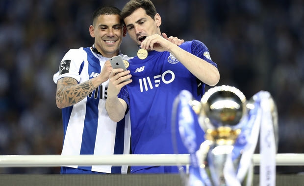 Porto goalkeeper Iker Casillas and teammate Maxi Pereira, left, take a selfie with their medals at the end of the Portuguese league soccer match between FC Porto and Feirense at the Dragao stadium in Porto, Portugal, Sunday, May 6, 2018. Porto clinched the league title Saturday night, two rounds before the end, when Benfica and Sporting CP tied 0-0 in their Lisbon derby. (AP Photo/Luis Vieira)
