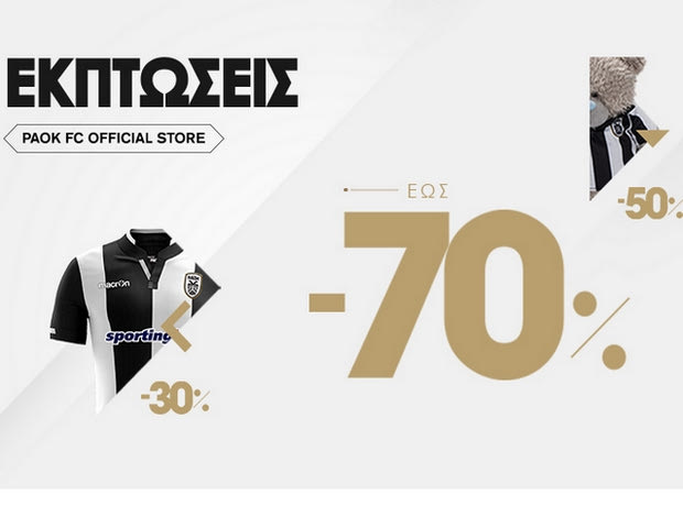 Η αγαπημένη περίοδος του χρόνου για τους καταναλωτές έφτασε και τα επίσημα καταστήματα του ΠΑΟΚ μπαίνουν στις εκπτώσεις με προσφορές που φτάνουν το 70% παρέχοντας στους πελάτες τους την ευκαιρία να προμηθευτούν τα αγαπημένα τους προϊόντα σε πολύ χαμηλές τιμές.