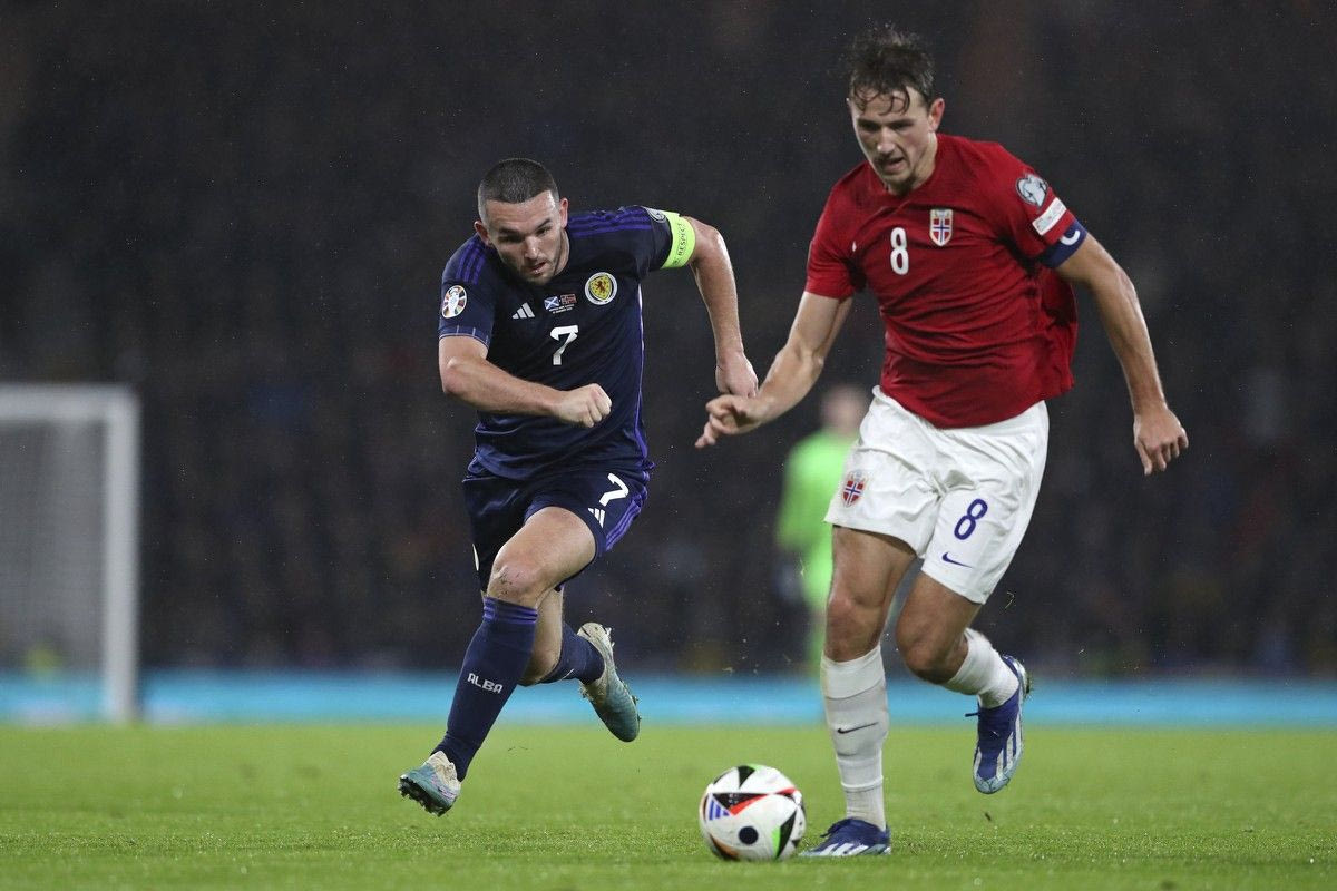 John McGinn of Scotland chases Sander Berge of Norway during the Euro 2024 group A soccer match between Scotland and Norway at Hampden Park in Glasgow, Scotland, Sunday, Nov. 19, 2023. (AP Photo/Scott Heppell)