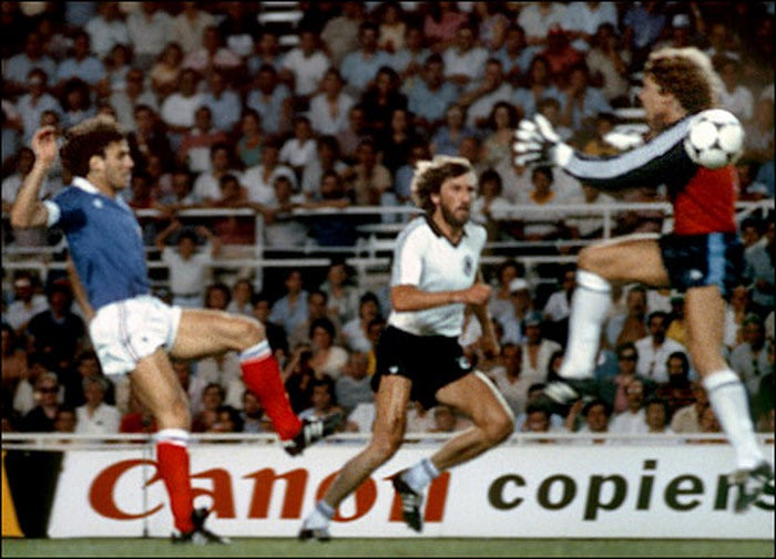 Κάτι ανάλογο είχε συμβεί στο Μουντιάλ του 1982, όταν κατά την διάρκεια του ημιτελικού μεταξύ Γαλλίας και Γερμανίας, ο γκολκίπερ των “πάντσερ” Χάραλντ Σουμάχερ ξάπλωσε στο έδαφος τον Πατρίκ Μπατιστόν.