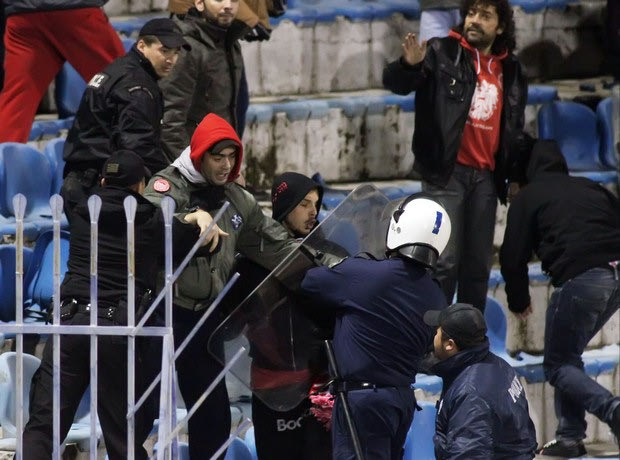 Οι οπαδοί των δύο ομάδων αντάλλαξαν σπασμένα καθίσματα, ενώ σημειώθηκαν και συμπλοκές με τα ΜΑΤ.