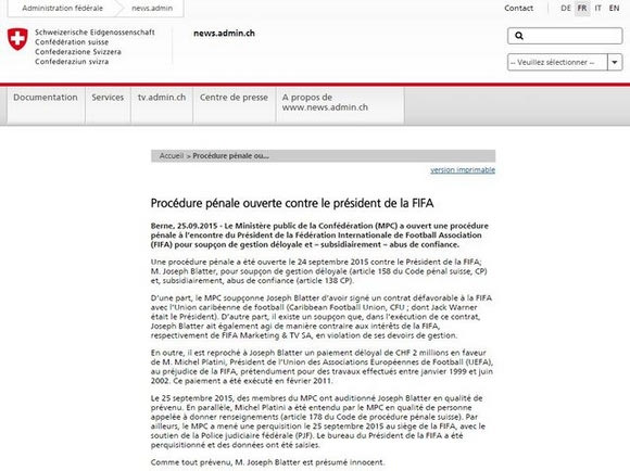 Επιπλέον, το Γραφείο του Εισαγγελέα της Ελβετίας ερεύνησε τα κεντρικά γραφεία της FIFA, με την υποστήριξη της Ομοσπονδιακής Εγκληματολογικής Αστυνομίας. Το γραφείο του πρόεδρου της FIFA ερευνήθηκε επίσης και κατασχέθηκαν δεδομένα. Όπως για όλους τους κατηγορούμενους, το τεκμήριο της αθωότητας ισχύει και για τον κύριο Σεπ Μπλάτερ”.