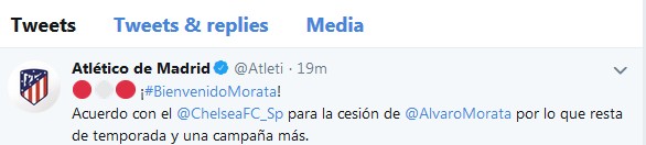 Παίκτης της Ατλέτικο είναι με κάθε επισημότητα ο Άλβαρο Μοράτα, με τους Μαδριλένους να κάνουν γνωστή τη συμφωνία τους με την Τσέλσι για την απόκτησή του για τον επόμενο 1,5 χρόνο.
