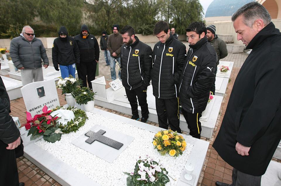 Αντιπροσωπεία ποδοσφαιριστών της Ένωσης, συνοδευόμενοι από τον Γενικό Αρχηγό της ΑΕΚ, τίμησαν τον Θέμη στην τελευταία του κατοικία (pics).