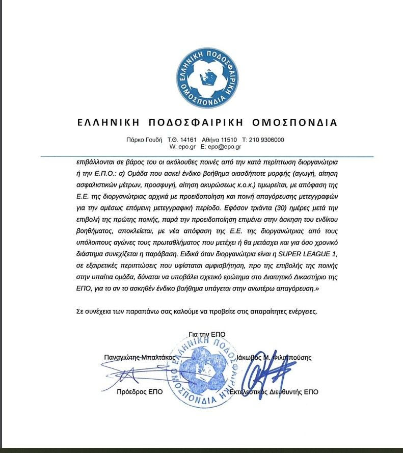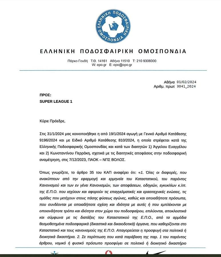Επιστολή ΕΠΟ για την αγωγή του Βόλου: “Αυτές είναι οι ποινές εφόσον επιμένετε”