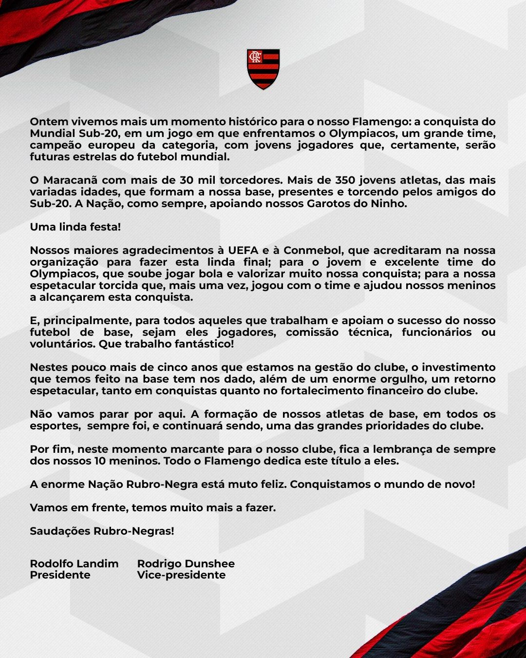 “Χθες ζήσαμε άλλη μια ιστορική στιγμή για τη Φλαμένγκο μας: την κατάκτηση του Διηπειρωτικού Κυπέλλου Κ20, σε ένα παιχνίδι όπου αντιμετωπίσαμε τον Ολυμπιακό, μια μεγάλη ομάδα πρωταθλήτρια Ευρώπης της κατηγορίας, με νεαρούς παίκτες που σίγουρα θα γίνουν μελλοντικά αστέρια του παγκοσμίου ποδοσφαίρου.