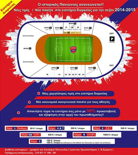 “Ο Ιστορικός Πανιώνιος ανανεώνεται. Νέες τιμές, νέα πακέτα στα εισιτήρια διαρκείας για την περίοδο 2014-15. Ξεκινάει η διάθεση των εισιτηρίων διαρκείας για την περίοδο 2014-15. Με νέες χαμηλότερες τιμές, νέα οικονομικά οικογενειακά πακέτα για τους αθλητές.Αποκτήστε τώρα τα εισιτήρια σας, μόνο με 30% προκαταβολή και εξόφληση στην αρχή του πρωταθλήματος!!”