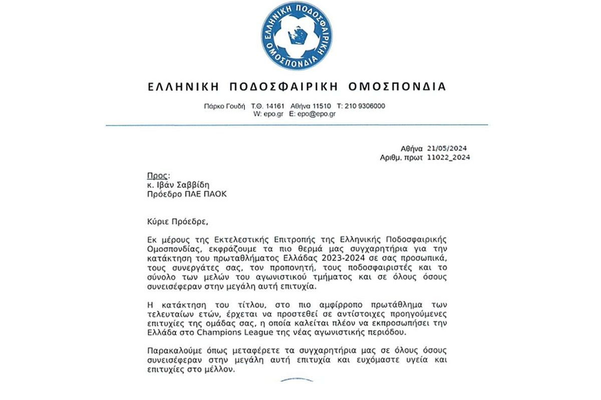 Η ΕΠΟ θέλησε να συγχαρεί τον ΠΑΟΚ για την κατάκτηση του πρωταθλήματος για την αγωνιστική περίοδο 2023-24 και το έκανε μέσω επιστολής προς την ομάδα της Θεσσαλονίκης.