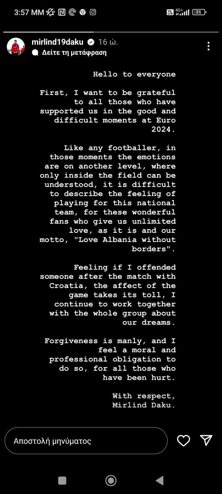 Ο παίκτης της Εθνικής Αλβανίας Μιρλίντ Ντάκου απολογήθηκε για τα υβριστικά συνθήματα του εναντίον της Βόρειας Μακεδονίας μετά τη λήξη του αγώνα με την Κροατία, την ώρα που η UEFA έχει ξεκινήσει έρευνα για το συγκεκριμένο περιστατικό.