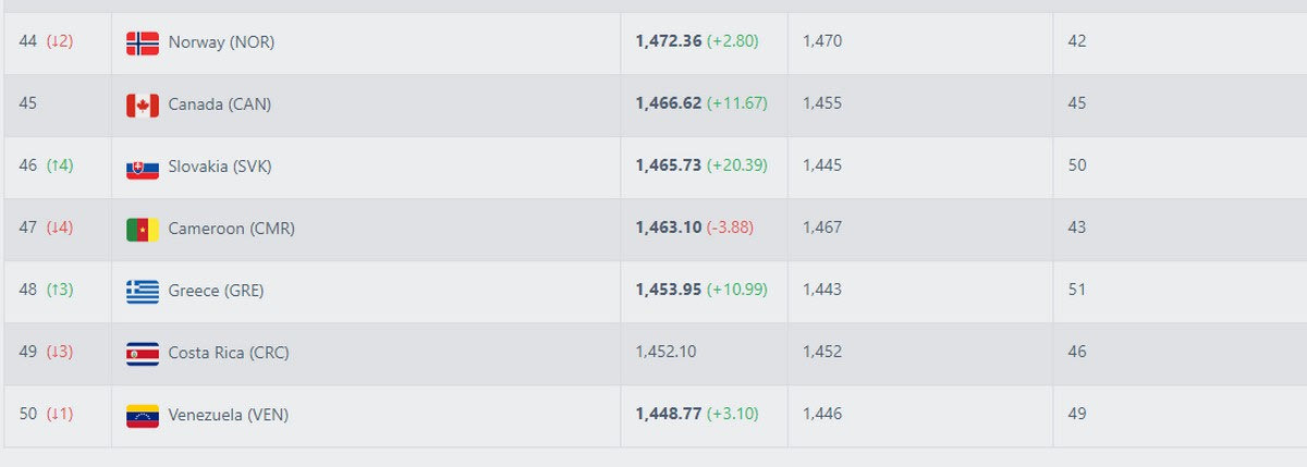Βάσει των τελευταίων αποτελεσμάτων η Ελλάδα έχει 1.463,85 πόντους και βρίσκεται πάνω από Κόστα Ρίκα και Βενεζουέλα, ωστόσο είναι πίσω από Καμερούν, Σλοβακία και Καναδά.