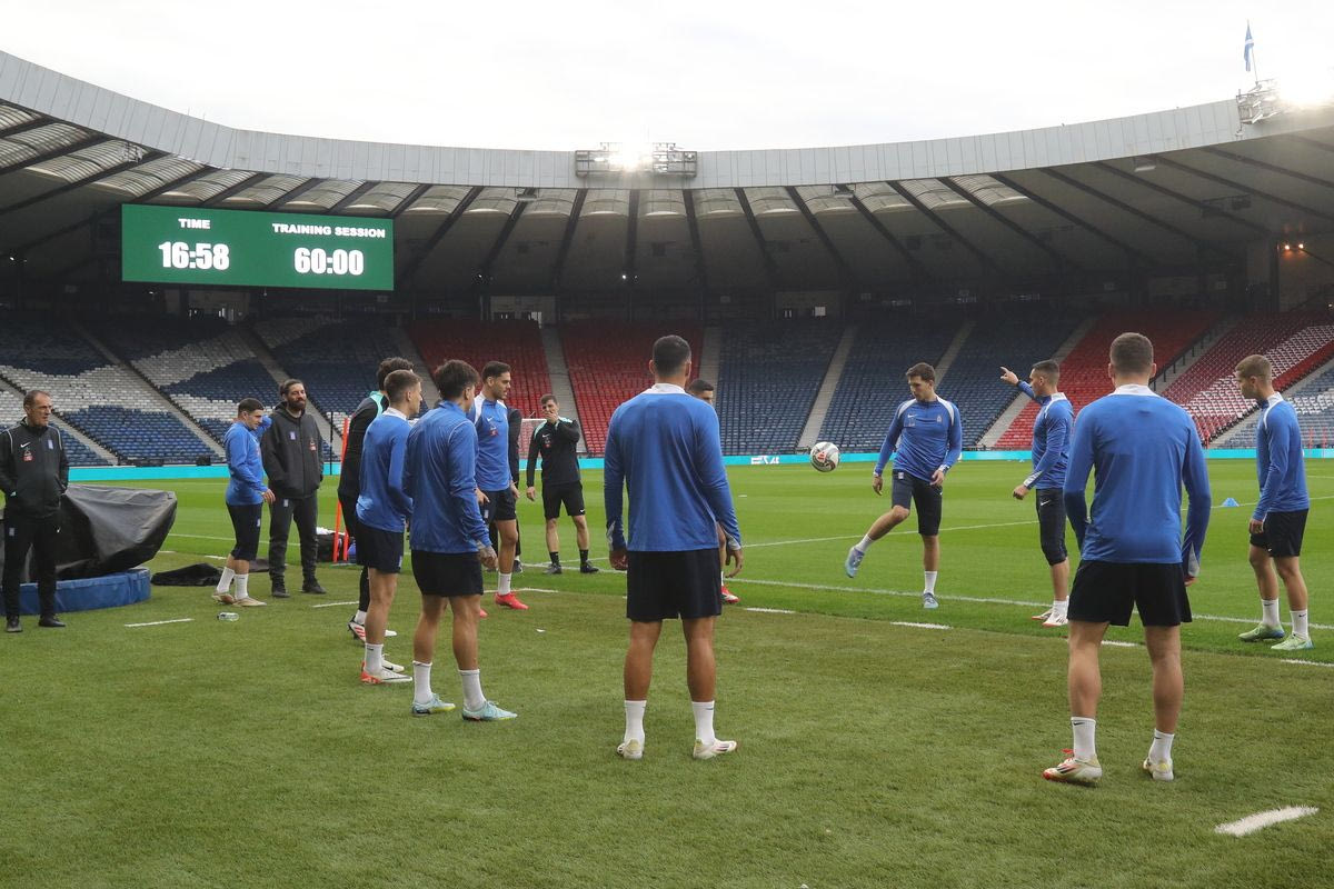 Η Ελλάδα αντιμετωπίζει τη Σκωτία για τα playoffs ανόδου και οι παίκτες του Ιβάν Γιοβάνοβιτς πραγματοποίησαν προετοιμασία στο θρυλικό Χάμπντεν Παρκ