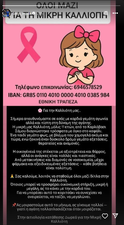 Στο πλευρό της μικρής Καλλιόπης, η οποία έχει διαγνωσθεί με όγκο στο κεφάλι, στέκονται οι Έλληνες διεθνείς, οι οποίοι μέσω αναρτήσεών τους έκαναν έκκληση για βοήθεια.