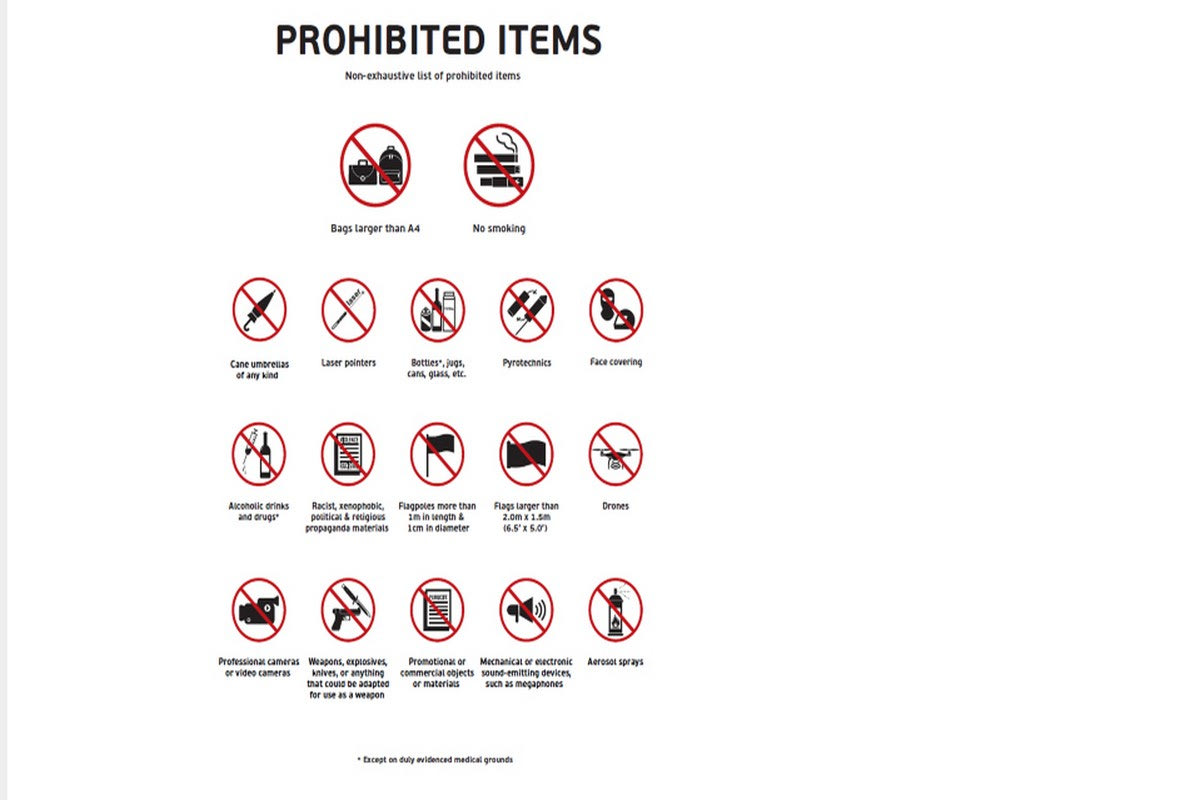 Η ΕΠΟ υπενθυμίζει στους Έλληνες φιλάθλους ότι πέραν της έγκαιρης προσέλευσης, θα πρέπει να ακολουθούν τις υποδείξεις των αρχών και να γνωρίζουν ότι απαγορεύεται να φέρουν μαζί τους μια σειρά αντικειμένων τα οποία απεικονίζονται στη φωτογραφία”:
