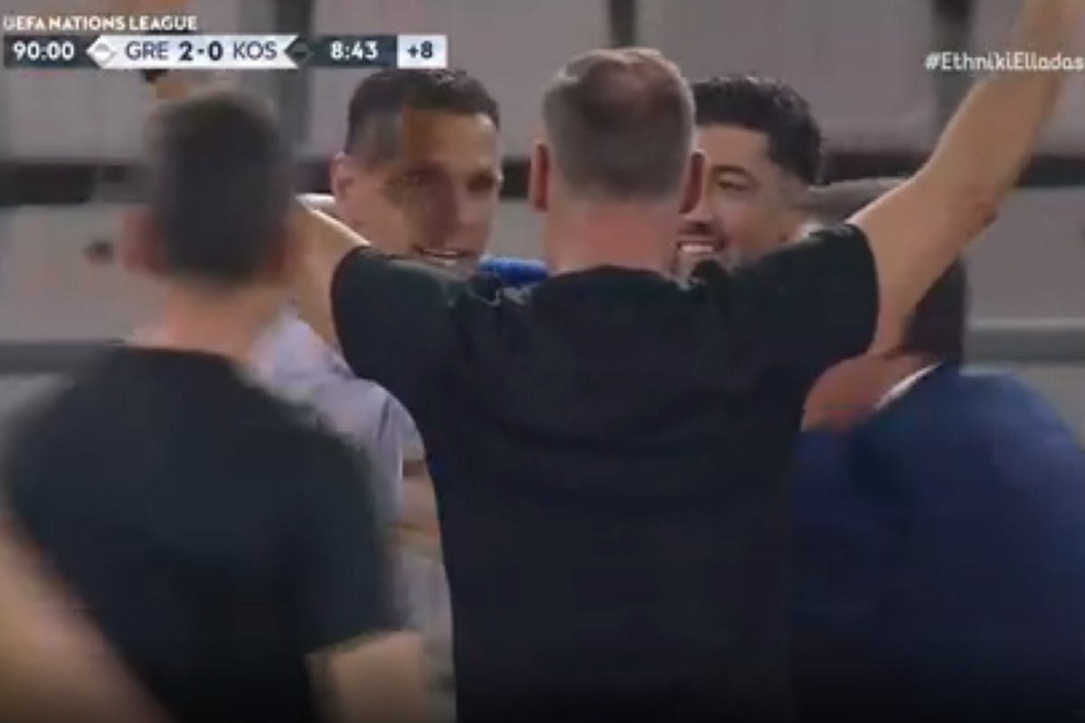 Μόλις η Εθνική Ελλάδος κλείδωσε τη νίκη απέναντι στο Κόσοβο με το γκολ του Πέτρου Μάνταλου στις καθυστερήσεις, ο Γκουστάβο Πογέτ και ο Τάκης Φύσσας πήγαν προς το μέρος του Δημήτρη Λημνιού, για να τον αγκαλιάσουν.