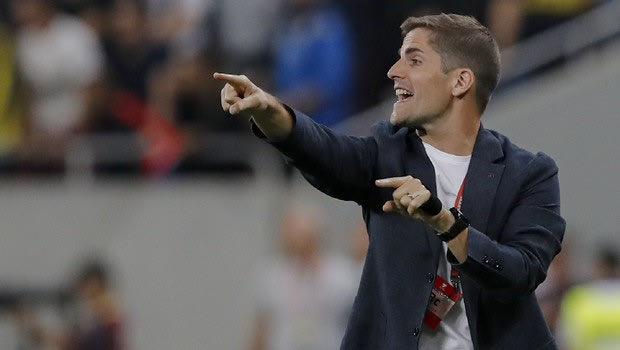 Spain's coach Robert Moreno gestures during the Euro 2020 group F qualifying soccer match between Romania and Spain, at the National Arena stadium in Bucharest, Romania, Thursday, Sept. 5, 2019. (AP Photo/Vadim Ghirda) AP Photo/Vadim Ghirda
